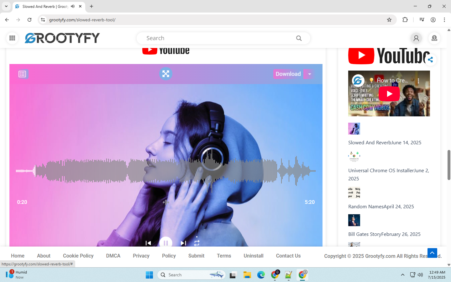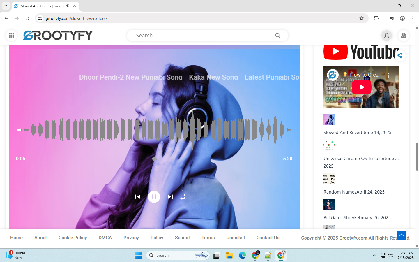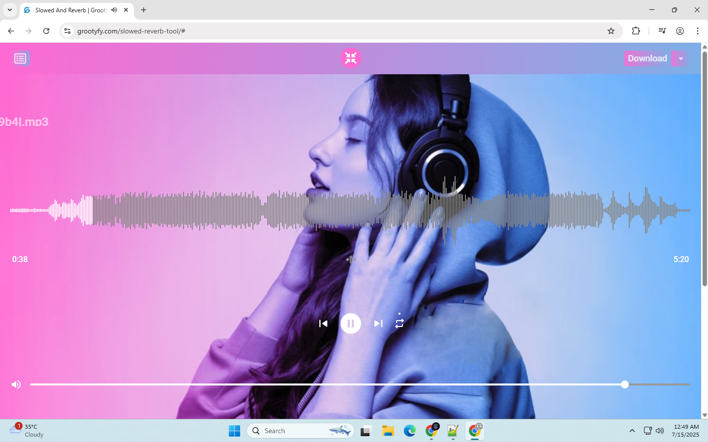 Grootyfy’s Slow & Reverb Tool is a complete browser-based music editing tool built for speed, simplicity, and creativity. It allows you to upload multiple songs to your playlist, customize each track individually, and apply advanced effects with intuitive controls. The interface is clean and user-friendly with real-time preview of all adjustments. Features include Slow + Reverb preset, Nightcore mode, speed, pitch, bass boost, reverb level, and a volume controller. You can set custom step sizes for sliders, set default settings, or copy specific slider values from one song to another. With seamless play/pause, next/back navigation, and easy download options, Grootyfy delivers the fastest way to remix music online.