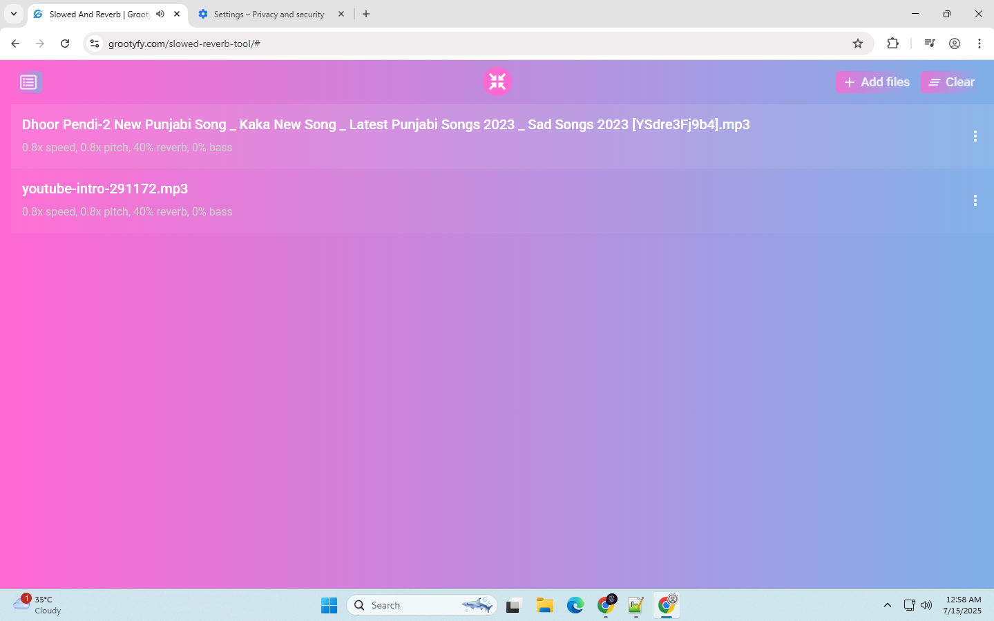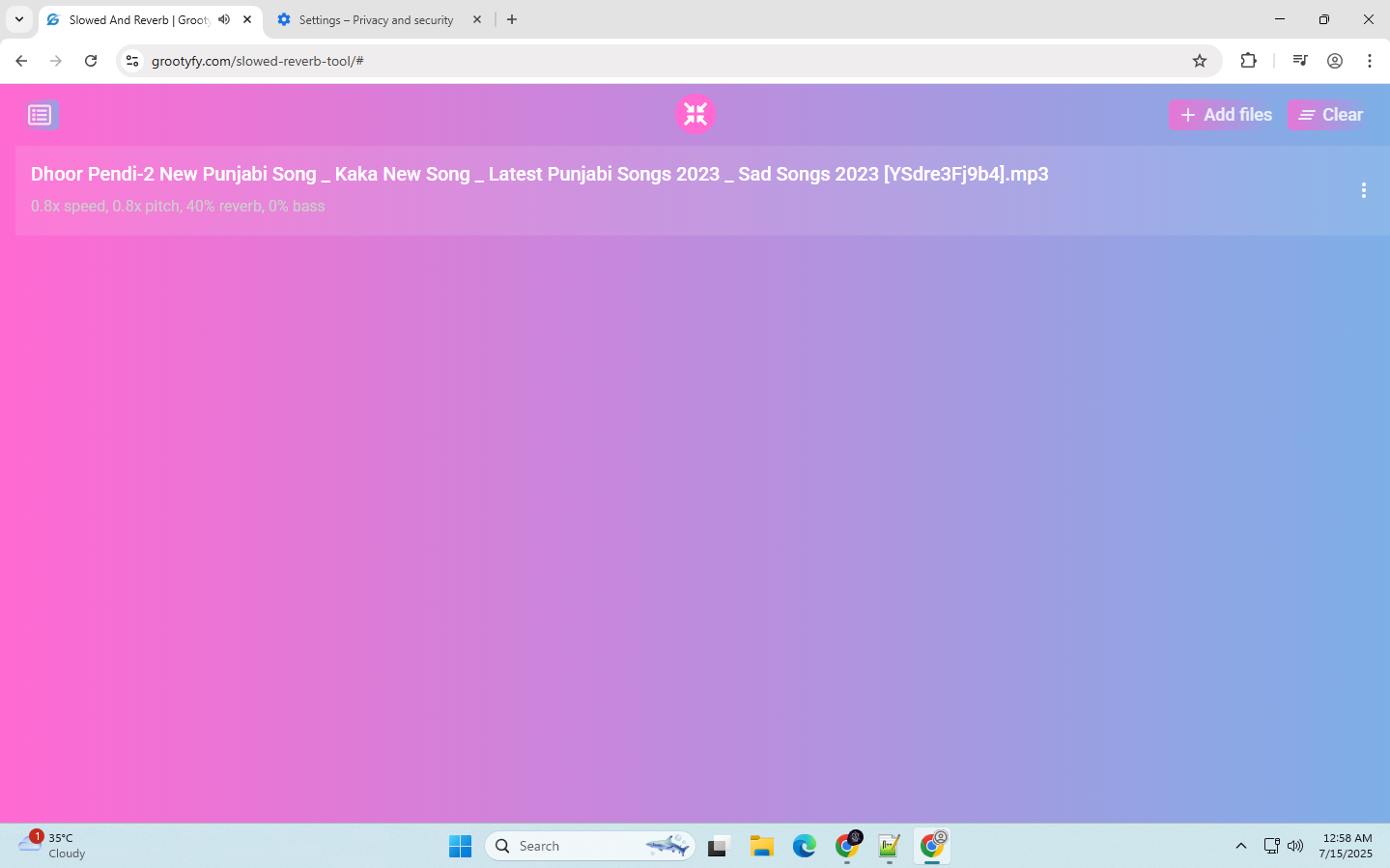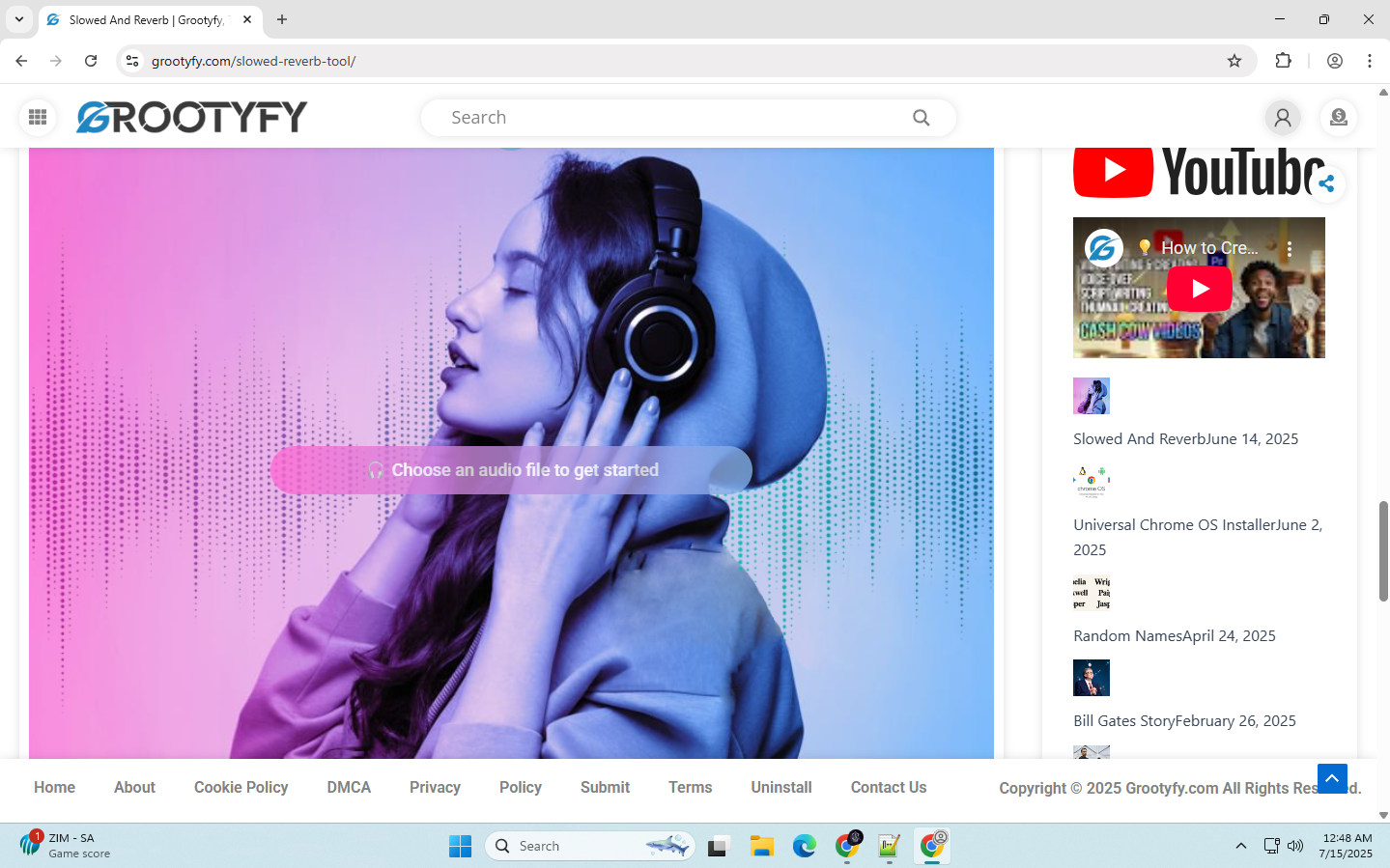Grootyfy’s Slow & Reverb Tool is a complete browser-based music editing tool built for speed, simplicity, and creativity. It allows you to upload multiple songs to your playlist, customize each track individually, and apply advanced effects with intuitive controls. The interface is clean and user-friendly with real-time preview of all adjustments. Features include Slow + Reverb preset, Nightcore mode, speed, pitch, bass boost, reverb level, and a volume controller. You can set custom step sizes for sliders, set default settings, or copy specific slider values from one song to another. With seamless play/pause, next/back navigation, and easy download options, Grootyfy delivers the fastest way to remix music online.